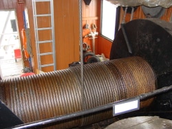 Der Haken oder auch Block ist zweifach geschoren, wie bei einem Flaschenzug, was die Last auf die Trommel viertelt. In dem Drahtseil befindet sich die Seele. Sie besteht aus Hanf und nimmt Fett und Schmierstoffe gut auf. Diese dienen der Konservierung des Seiles. Das Lose Ende ist mit einer Glocke die vergossen wurde an der Spitze des Auslegers fest montiert .